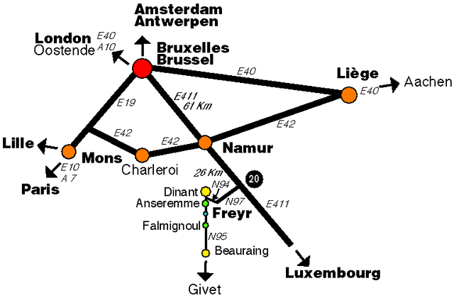 l'autoroute E411-A4, prendre la sortie N° 20 (Dinant "poids lourds" - 5 km - N97). Ensuite, la N94