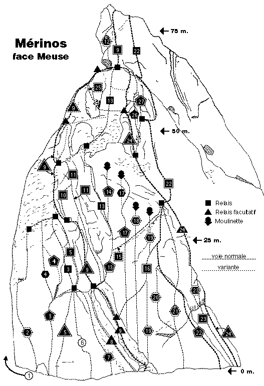 | Directement à droite du départ du Mérinos dans un mur très vertical, rejoindre la 25 ème. Ë l'origine, la voie sortait par les Crêpes, mais un tronon ouvert en 1992 (P. Masschelein) prolonge la voie jusqu'à une moulinette. |
