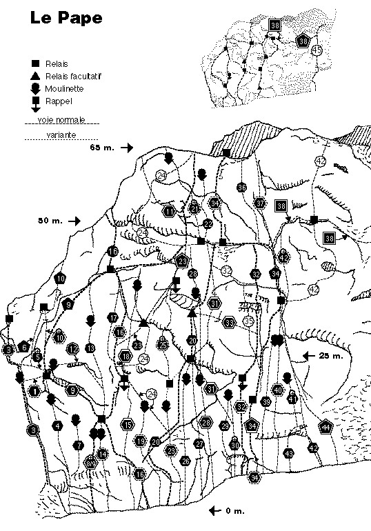| Départ à l'extrème gauche de la grotte du départ du Pape. Un crochet à gauche, puis tout droit jusqu'à la moulinette. Il est possible de continuer par la Française ou le Pape. |